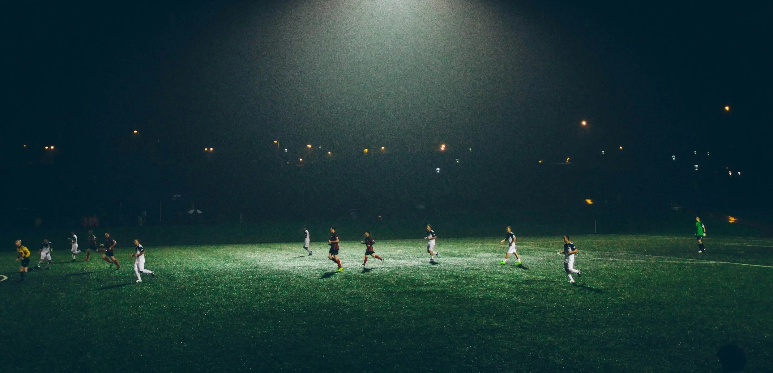 Soccer players on a field at night under stadium lights, engaged in a match.